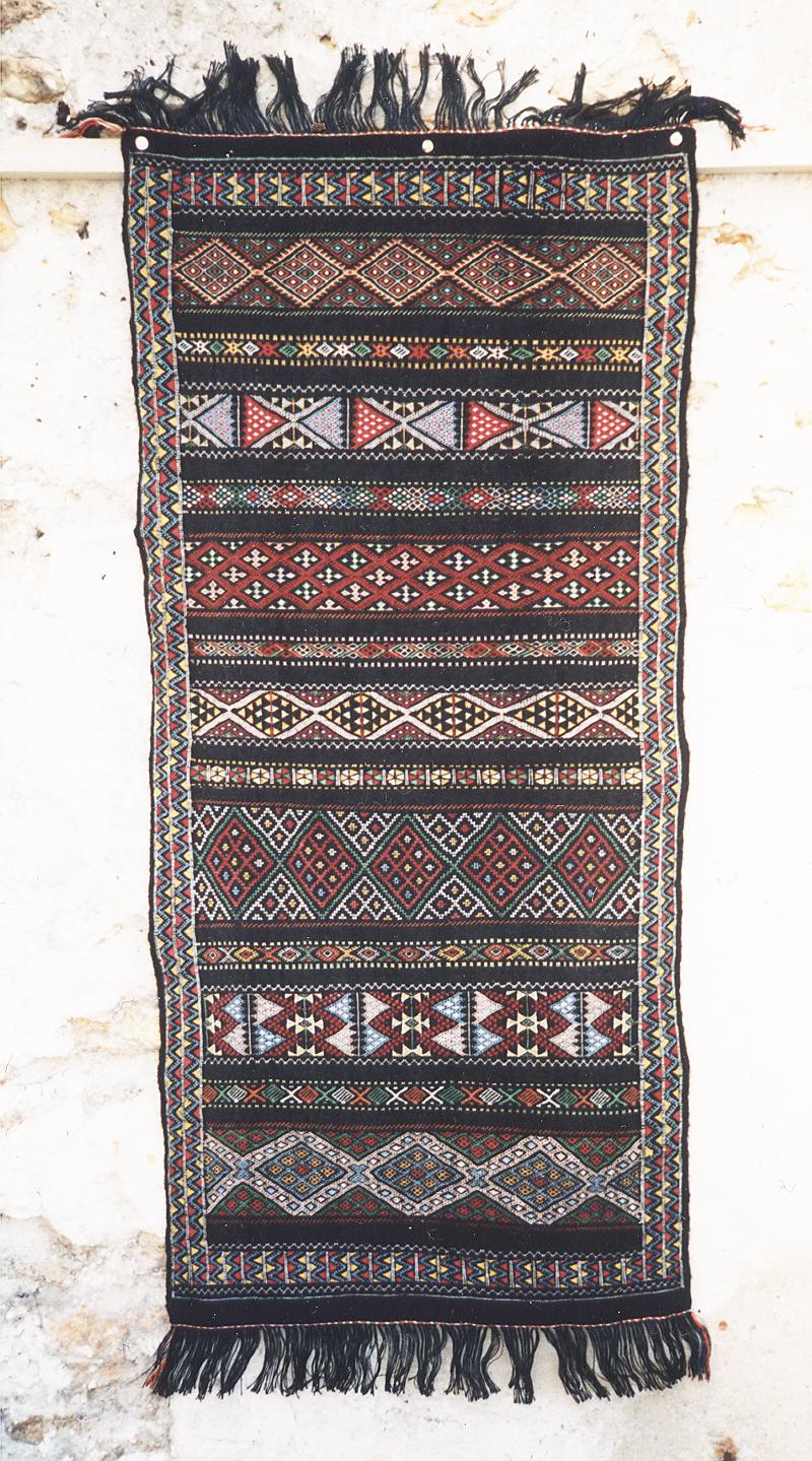 Les manches ont étés réalisés à partir d'un tissage en pure laine trés fine noire, tissée main avec fil de broderie. Les motifs sont berbères.